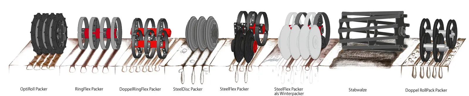 OptiRoll, OptiCover, RingFlex, двойной RingFlex, SteelDisc, SteelFlex, SteelFlex для подготовки зяби, прутковый каток и двойной RollPack.
