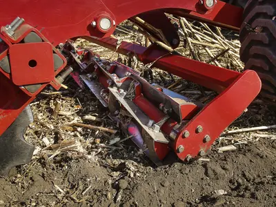 Каток диаметром 300 мм и 6 режущими ножами на всю ширину захвата машины. Высокая частота вращения придает катку дополнительное измельчение. Ножи, монтированные под небольшим углом к оси катка, обеспечивают конструкции необходимую жесткость и уравновешивают силы противодействия. Каток работает под давлением до 100 бар и имеет гидравлическую защиту от перерузок. Этот инструмент идеален для измельчения стеблей промежуточных культур, рапса, подсолнечника или кукурузы. Каток-измельчитель также очень эффективен в борьбе с кукурузным мотыльком.