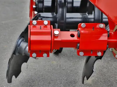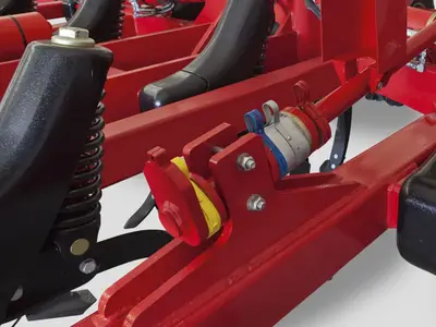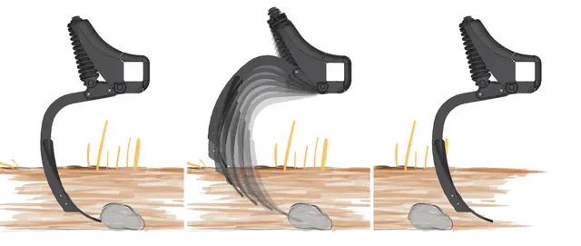 Сила противодействия защиты по мере сжатия пружин колеблется в диапазоне 500 кг – 175 кг, что уменьшает нагрузку на раму машины. Оптимизированный пакет пружин обеспечивает также и точное ведение лап по глубине – в т.ч. на тяжелых почвах и большой глубине обработки. Высокопрочные материалы и большой диаметр деталей в узлах вращения не требуют ни единой точки смазки.