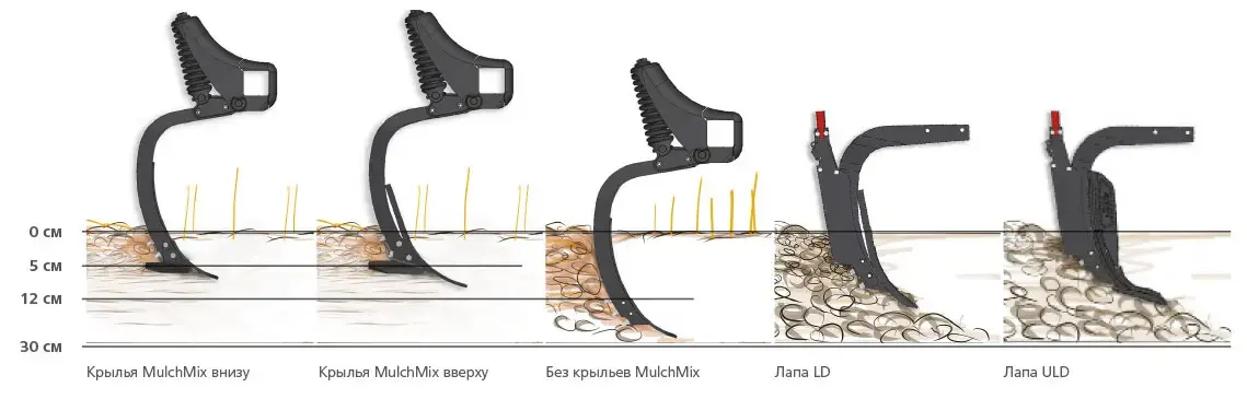 Для глубокого рыхления без перемешивания рекомендованы лапы HORSCH LD, позволяющие эффективное разуплотнение на глубину до 15 см без перемещения больших объемов почвы.