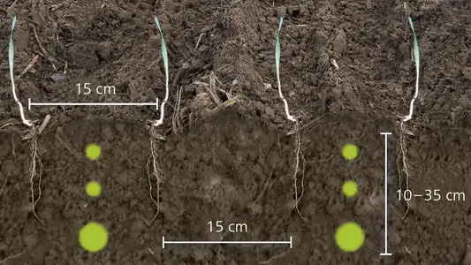 Расположенные в два ряда стойки TerraGrip 3L рыхлят почву полосами через 50 см, закладывая депо удобрений на разную глубину (глубоко = глубина рыхления, мелко = на поверхности, или комбинированно).