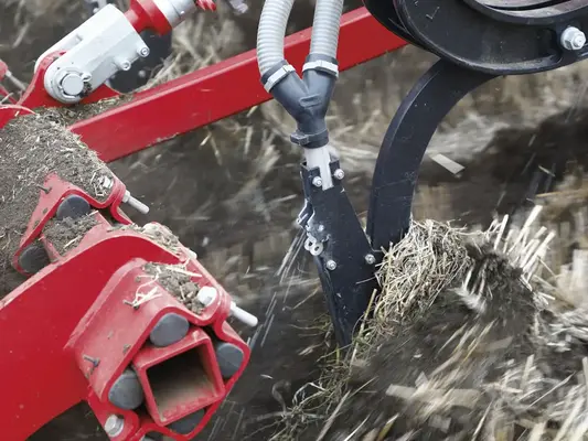 - Стойка TerraGrip рыхлит почву для двух рядов посева культуры, закладывая депо удобрений (на разную глубину) в междурядья