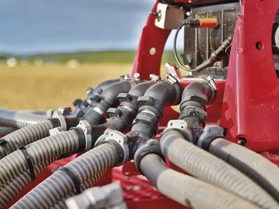 Для оптимального распределения посевного материала по всей ширине захвата имеется 6 равномерно расположенных выходов перед или за катком для машин рабочей шириной захвата до 3 м и 12 выходов для машин рабочей шириной захвата от 4 м. Для специальных решений есть MiniDrill Solo с центральным подающим трубопроводом. В таком случае MiniDrill может быть напрямую соединен с распределительной башней. Подачу компонента к выходам обеспечивает гидравлический вентилятор с очень плавным ходом и расходом масла всего 20-25 л/мин, благодаря чему оборудование может агрегатироваться с любым трактором.