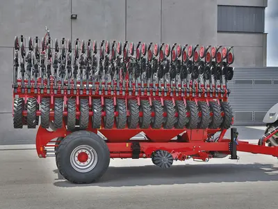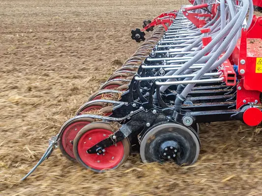 Обратный звонокHORSCH предлагает новый посевной комплекс Serto SC с рабочей шириной 10 и 12 м. Его главные особенности – компактная система складывания и сплошной колесный почвоуплотнитель на всю ширину захвата в комбинации с тяжелыми двухдисковыми высевающими сошниками. По аналогии с Pronto здесь тоже за каждым колесом почвоуплотнителя следуют два высевающих сошника с шириной междурядий 16,6 см. Задача почвоуплотнителя – выровнять и уплотнить посевное ложе перед сошниками.
