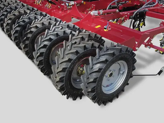 Колёса тандемного почвоуплотнителя смещены и благодаря такому расположению хорошо самоочищаются без скребков. « Елочный » рисунок протектора колёс и переменная деформация обеспечивает даже в чрезмерно влажных условиях их самоочистке.Средний сегмент тандемных колёс служит в качестве транспортного шасси по дороге. Дополнительный передний почвоуплотнитель усиливает измельчение комков и выравнивавание почвы, что в свою очередь положительно отражается на точном выдерживании горизонта посева.