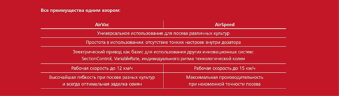 Система AirVac основана на использовании эффекта вакуума, когда семя под воздействием силы тяги внутри дозатора присасывается к отверстию дозирующего диска. Система AirSpeed, напротив, использует избыточное давление, когда зерновки / семянки под воздействием нагнетаемого сжатого воздуха плотно прижимаются к диску. В обоих типах дозаторов используюется семясъемник, предотвращающий образование двойников, который не требует дополнительной тонкой настройки. Семясъемник также не нужно менять при переходе с одной культуры на другую, т.к. его особая оптимизированная форма является гарантом правильной расстановки растений при работе в любых условиях.