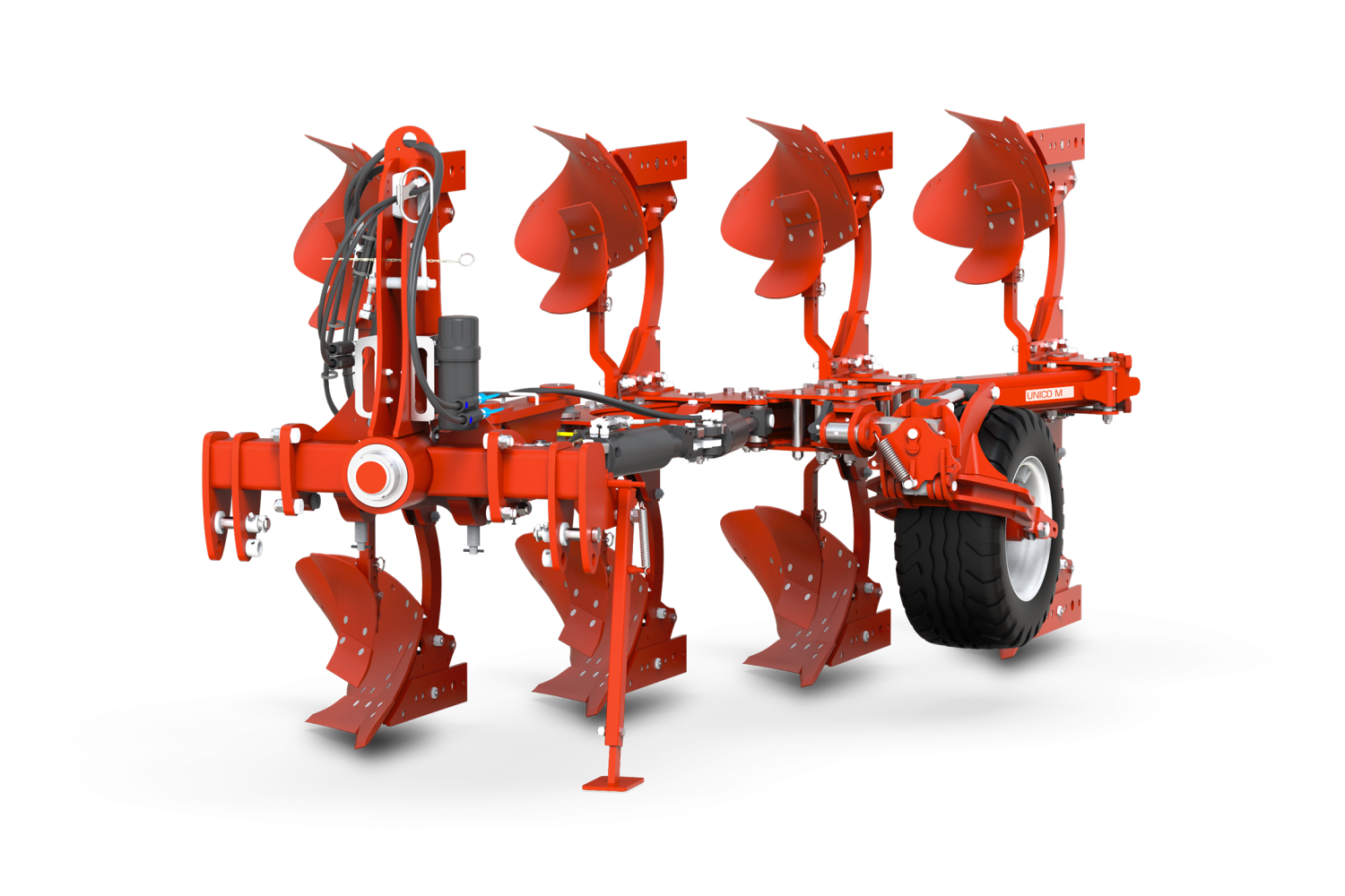 Модульная конструкция подразумевает наличие стандартной рамы, рассчитанной на установку трех или четырех корпусов плуга, с возможностью присоединения дополнительного корпуса с помощью соединительной пластины на болтах (стандартная комплектация для расширяемых версий), что означает, что сборка может быть выполнена в считанные секунды. Башня UNICO была разработана таким образом, чтобы обеспечивать максимальную надежность и стабильность плуга во время эксплуатации и при транспортировке. Верхняя тяга и вал разворота закреплены в одном корпусе, к которому крепятся болтами съемные кронштейны нижних тяг. Такая уникальная конфигурация позволяет выбирать между жесткой, поворотной и быстроподключаемой навесками для агрегатирования с любым трактором.