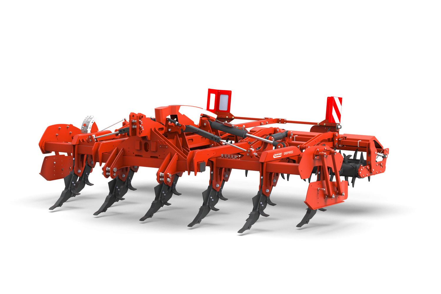 Рама отличается прочностью и надежностью, присущими серии ARTIGLIO. Центральное крепление было модифицировано, чтобы обеспечить быстрое и простое складывание двух крыльев с помощью двух больших гидравлических цилиндров. Два дополнительных механических рычага обеспечивают механический упор для крыльев. Новая рама со сварным креплением зубьев (система CSS) и крыловидные рабочие стойки толщиной 35 мм с лезвиями, покрытыми карбидом вольфрама, обеспечивают глубину обработки 50 см даже при работе с растительными остатками. Каждая лапа оснащена срезным болтом.