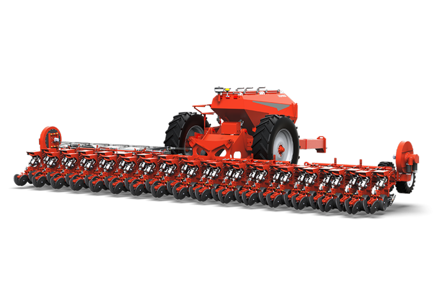 Высевающий элемент MTR HD соединен с рамой прицепного типа с двумя складывающимися и плавающими секциями с максимальным наклоном до 10°, обеспечивая транспортную ширину в 3,5 м, что облегчает перевозку сеялки по дорогам общего пользования. Учитывая большую рабочую ширину, впечатляющий бункер, поддерживаемый основной рамой, обеспечивает высокую автономность, благодаря внутренней перегородке объемом 2000 литров для семян и 7000 литров для удобрений.