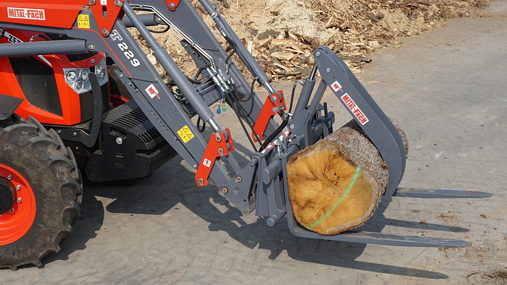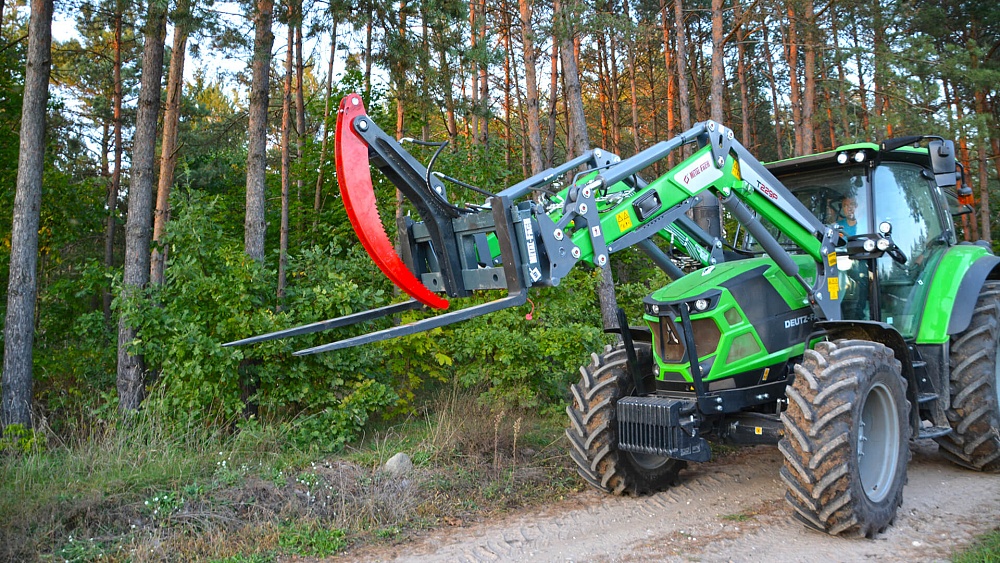 Обратный звонокЗахват для брёвен. Устанавливается на вилы для поддонов Metal-Fach. Система крепления помогает установить или снять захват за 2 минуты, при этом вилы для поддонов сохраняют свой прямой функционал. Захват имеет увеличенный угол поворота верхней лапы. Максимальный диаметр бревна 900мм. Захват поставляется с комплектом РВД. Для установки требуется наличие третьей линии гидравлики на фронтальном погрузчике.