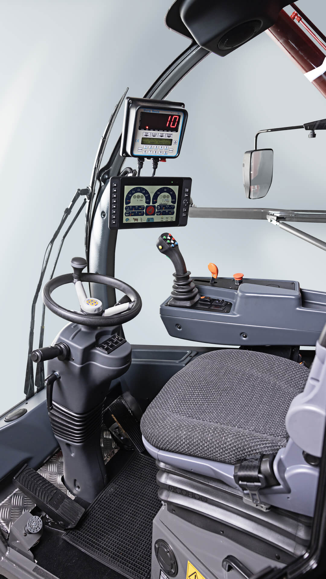 – Кабина с вентиляцией и подогревом, рулевое колесо и регулируемое сиденье, панорамный обзор 360 °, раздвижная стеклянная дверь, лобовое стекло спереди и сбоку, радио с RDS, эргономичные элементы управления
