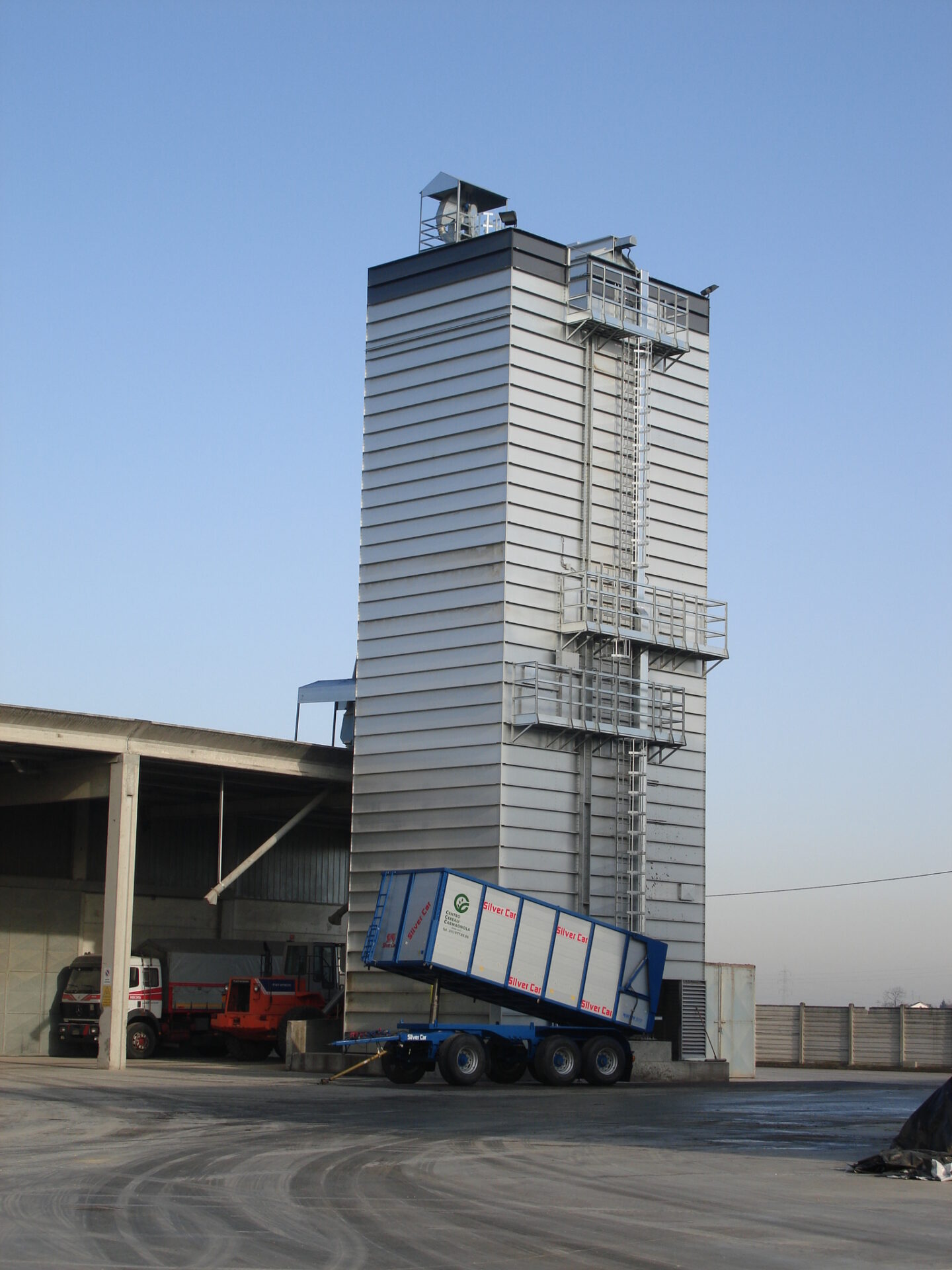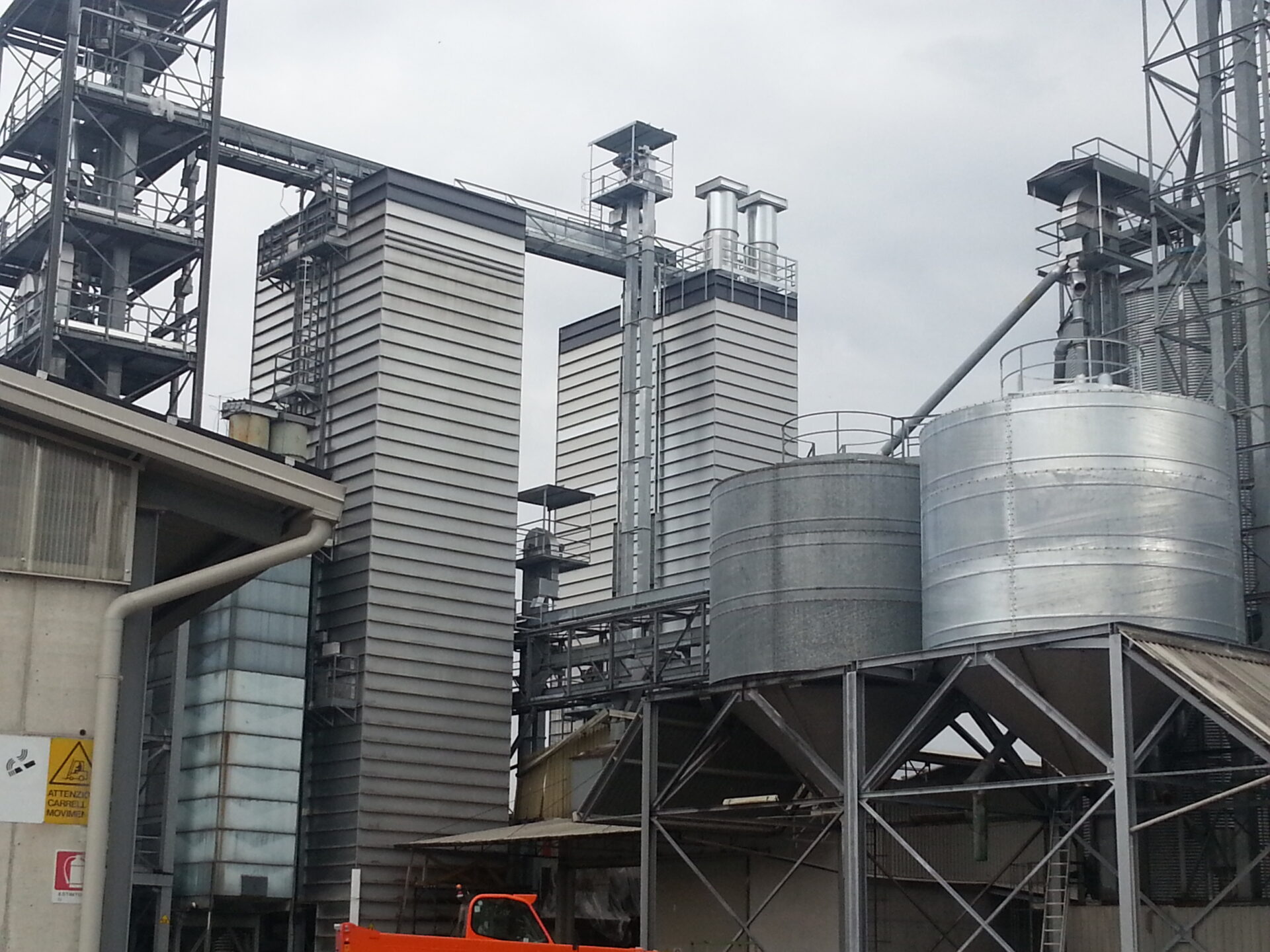 — Сушильная башня со ступенчатыми тоннелями из стали ALUZINK; вытяжные тоннели верхней части сушилки из нержавеющей стали; внутренняя обшивка панелями из стали ALUZINK.