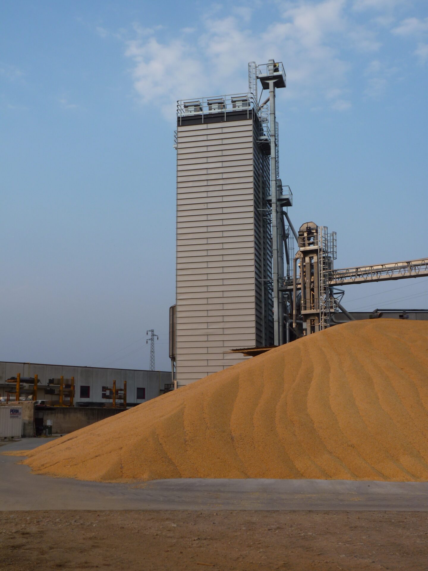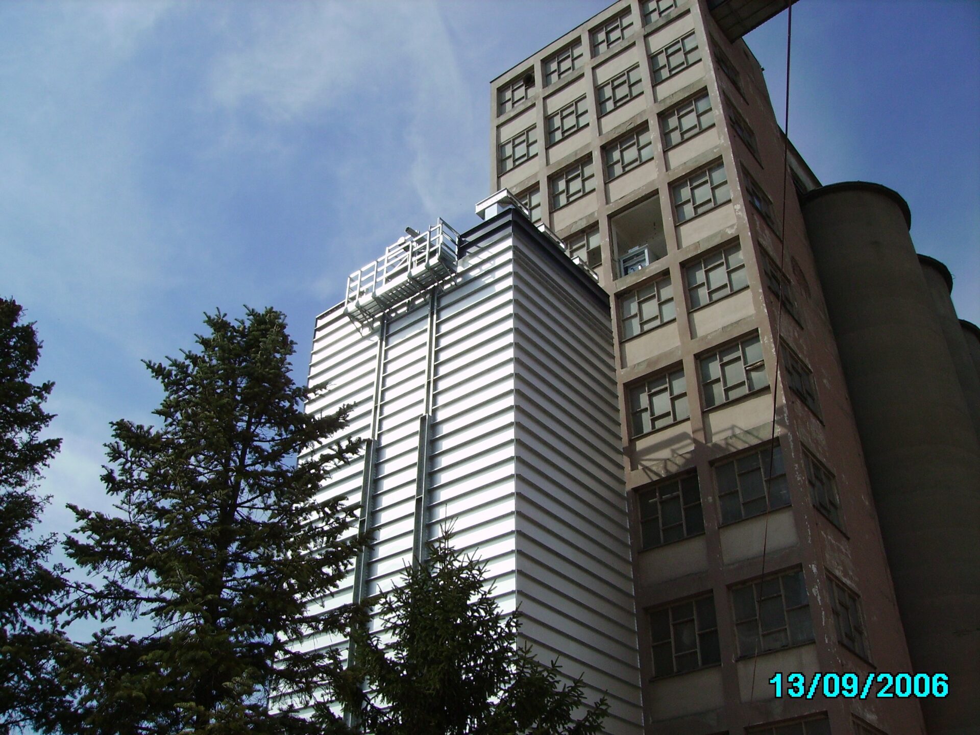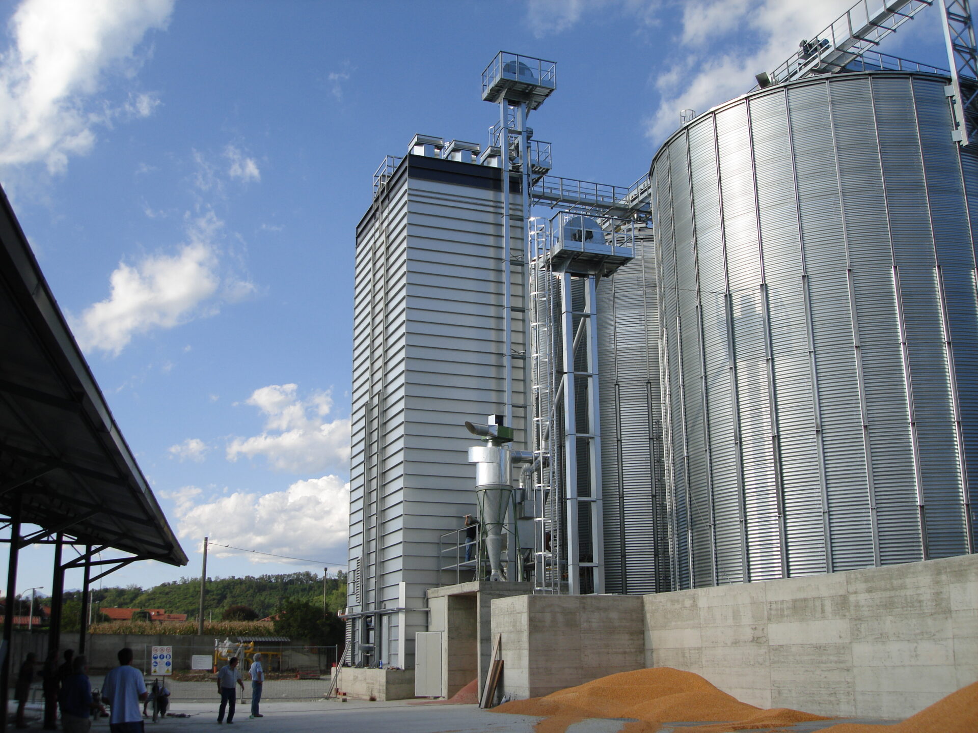 — Сушильная башня со ступенчатыми тоннелями из стали ALUZINK; вытяжные тоннели верхней части сушилки из нержавеющей стали; внутренняя обшивка панелями из стали ALUZINK.