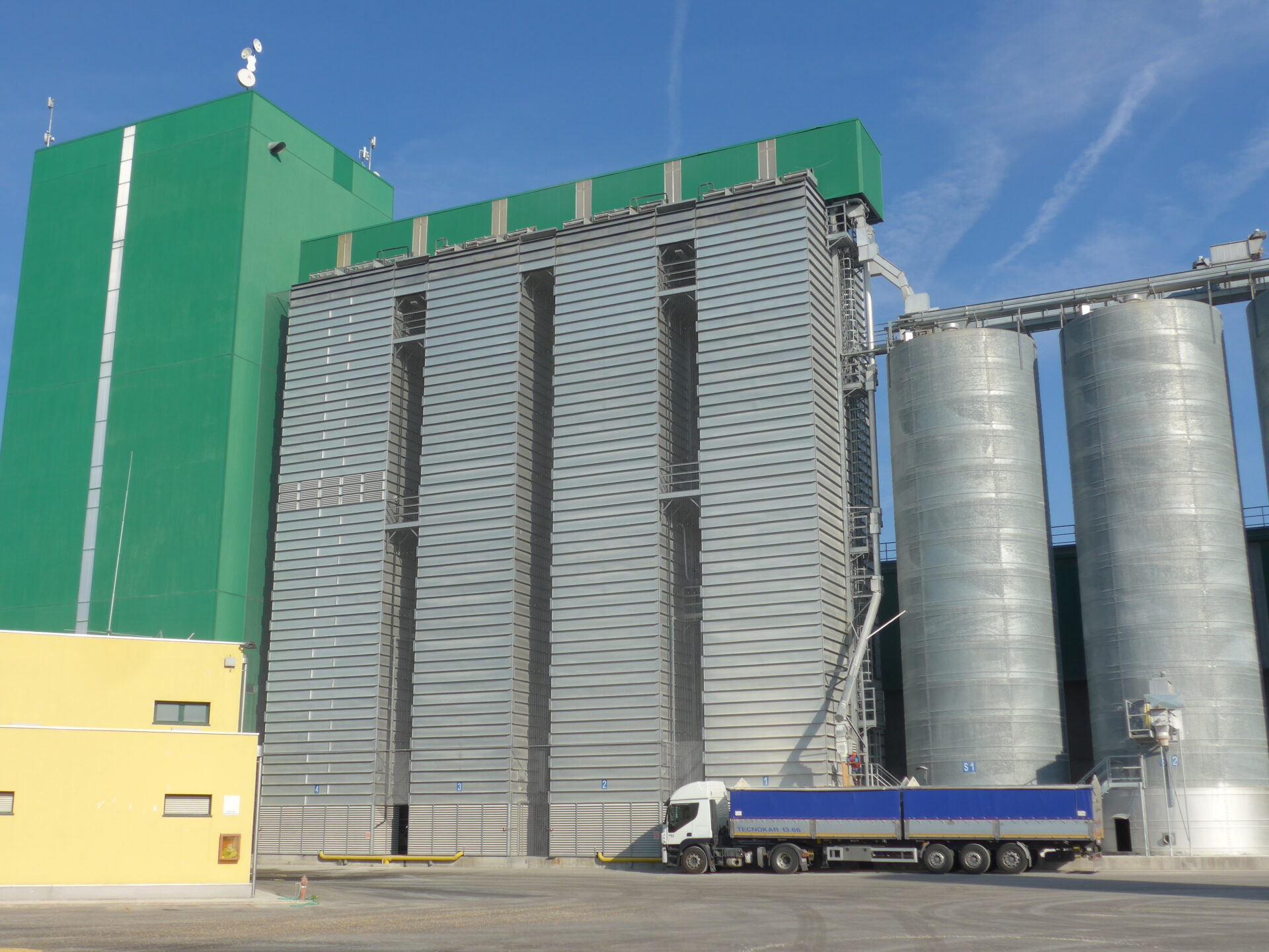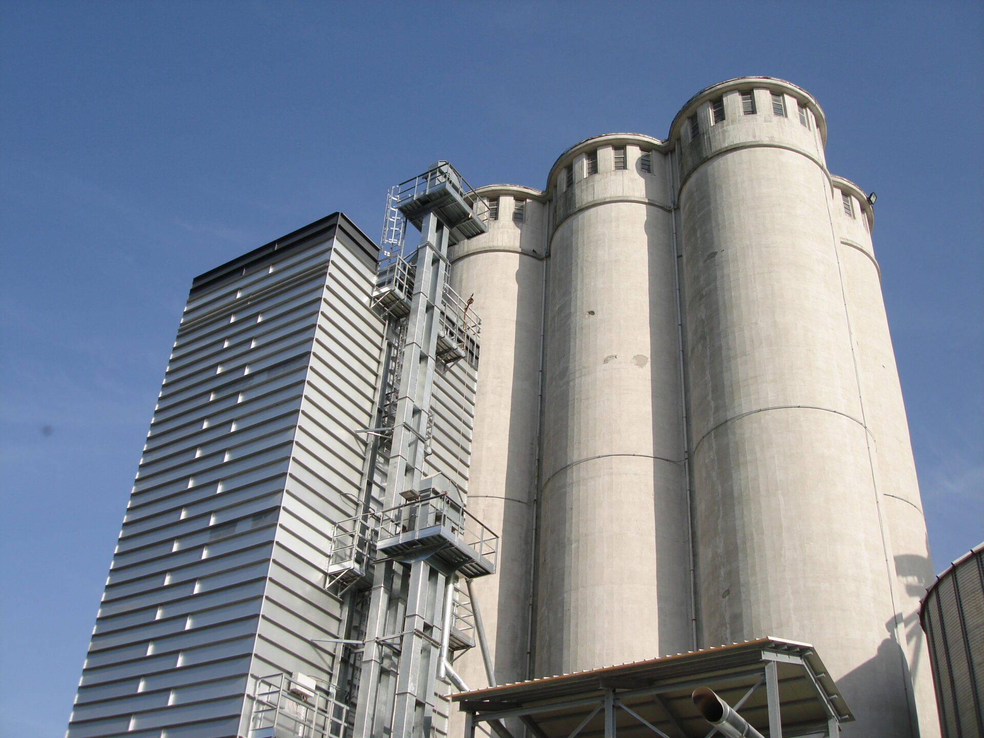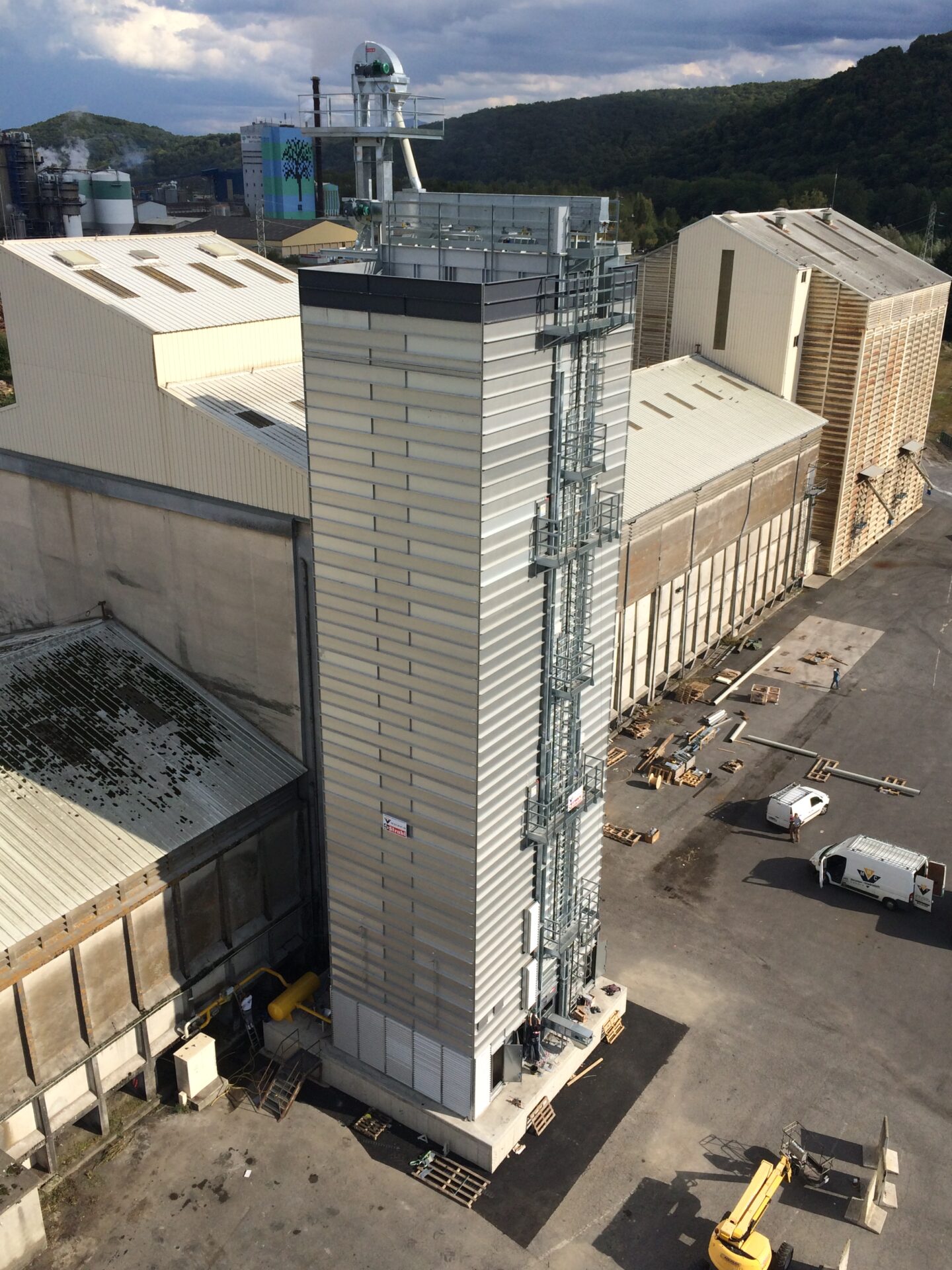 — Сушильная башня со ступенчатыми тоннелями из стали ALUZINK; вытяжные тоннели верхней части сушилки из нержавеющей стали; внутренняя обшивка панелями из стали ALUZINK.