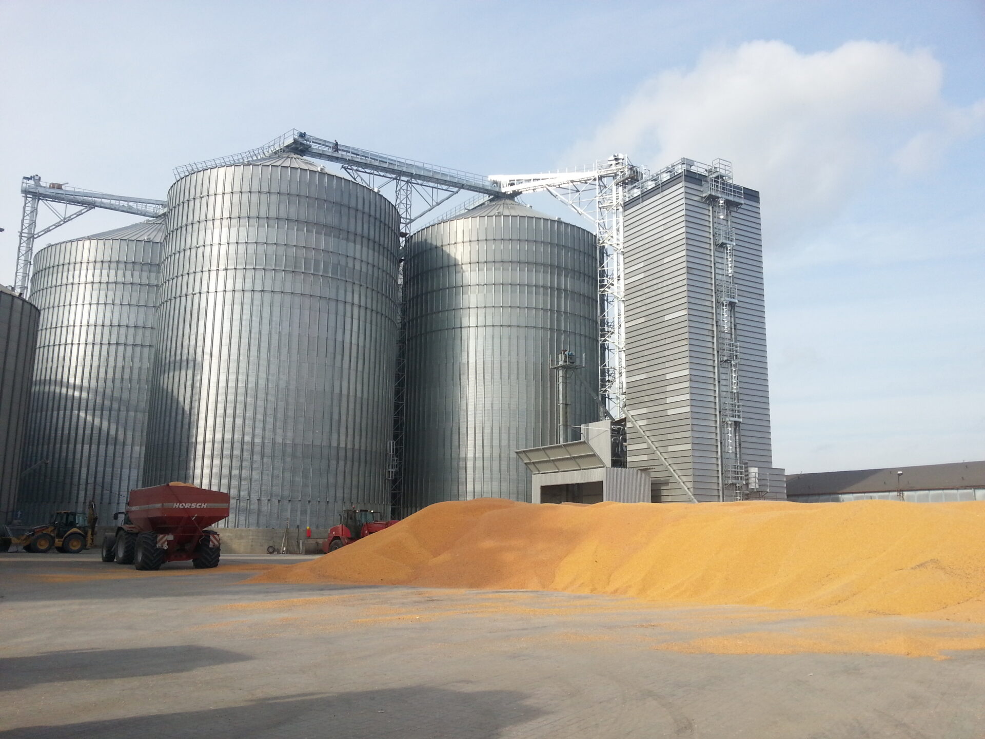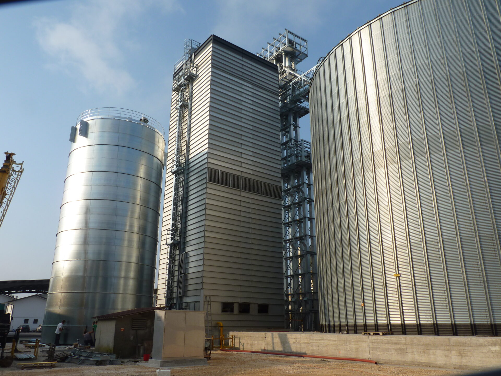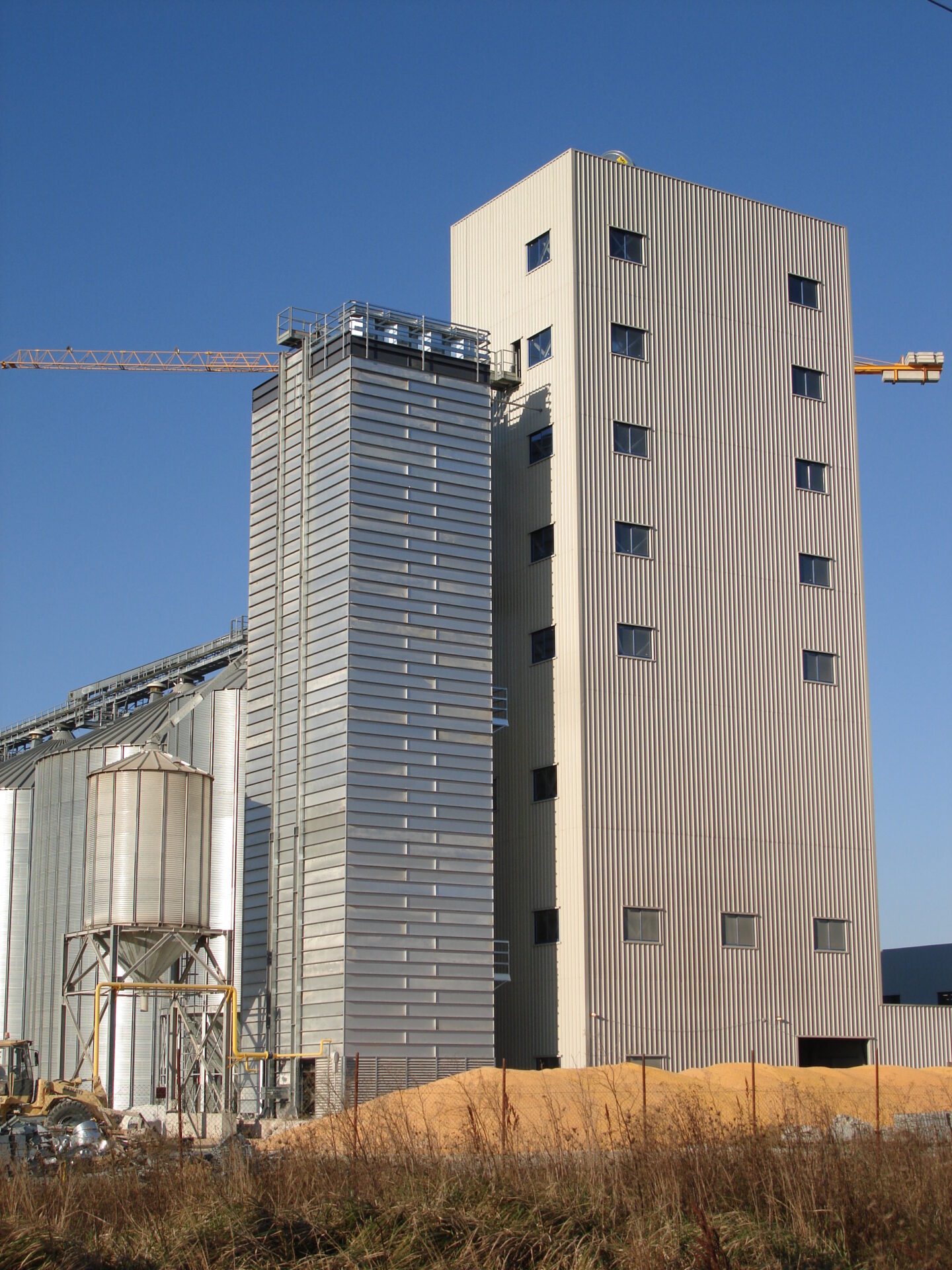 — Сушильная башня со ступенчатыми тоннелями из стали ALUZINK; вытяжные тоннели верхней части сушилки из нержавеющей стали; внутренняя обшивка панелями из стали ALUZINK.